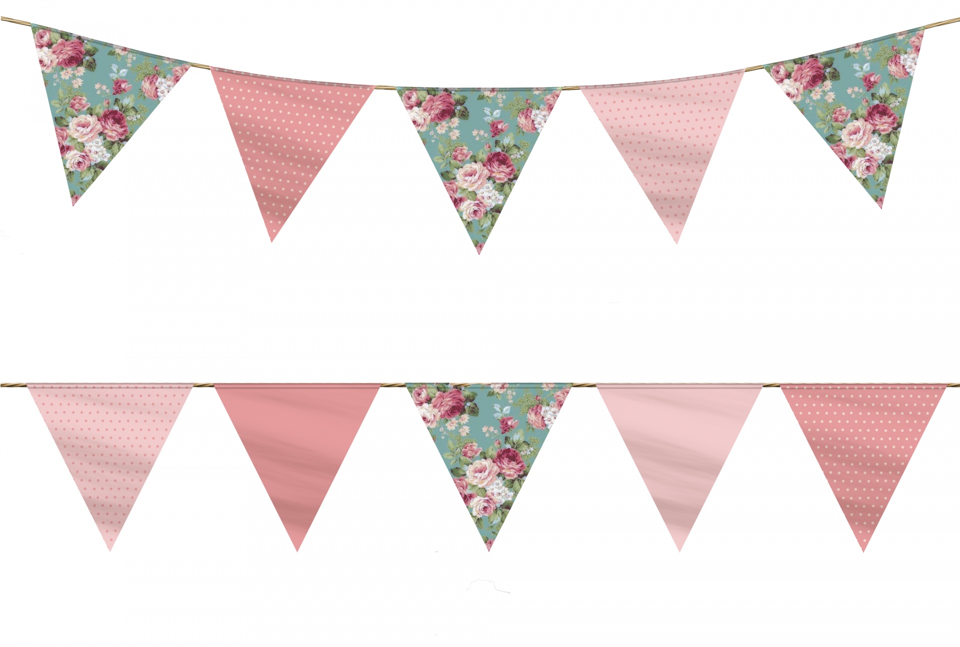 Vintage bunting in green and pink with roses, polka dots, and plain backgrounds.